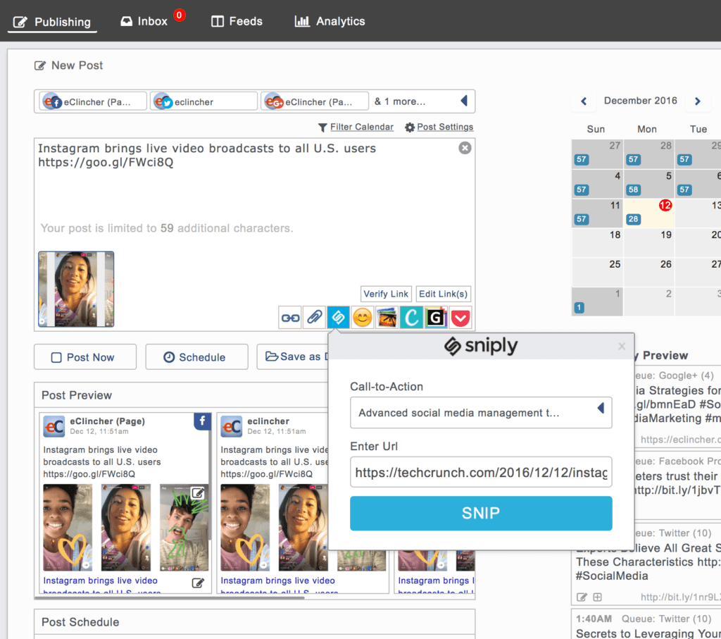 You can now connect your Sniply account in the eClincher dashboard. You can then easily create and share Sniply links directly from eClincher.eClincher has many other features to take advantage of, including: