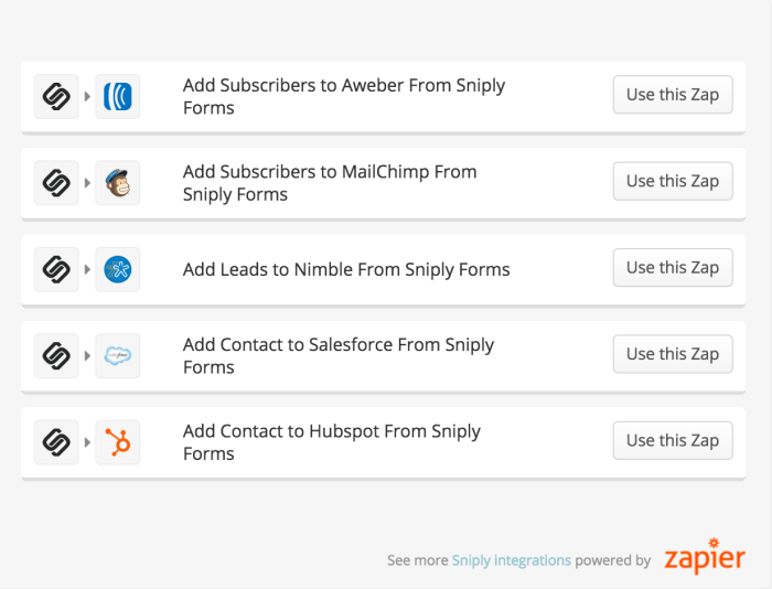 The beauty of the Zapier Sniply integration is that you can make it your own using online marketing tools already part of your routine. Zapier makes it easy by walking you through the process to make a Zap from scratch for tools you use to work with the information collected from Sniply forms.