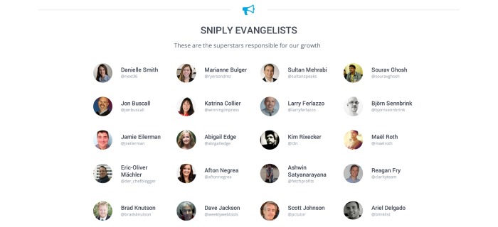 At Sniply, our About Page is less about our team and more of a hall of fame for the people who made a real difference on our journey. We feature our mentors and advisors. We showcase our evangelists, fans, and friends. We are proud to have their support and they are delighted to be acknowledged.