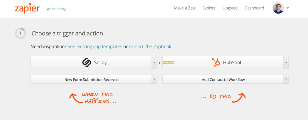 If you would like to customize how your Sniply form submissions get sent to HubSpot, you can use Zapier to set up your own custom integration (Zap). From your Zapier dashboard, click “Make a Zap”. In the trigger app, choose “New Form Submission Received” from Sniply. Choose HubSpot as your Action app, and select the action that you would like HubSpot to take when you receive a new Sniply Form Submission. In the next step, you will need to connect both accounts to Zapier.
