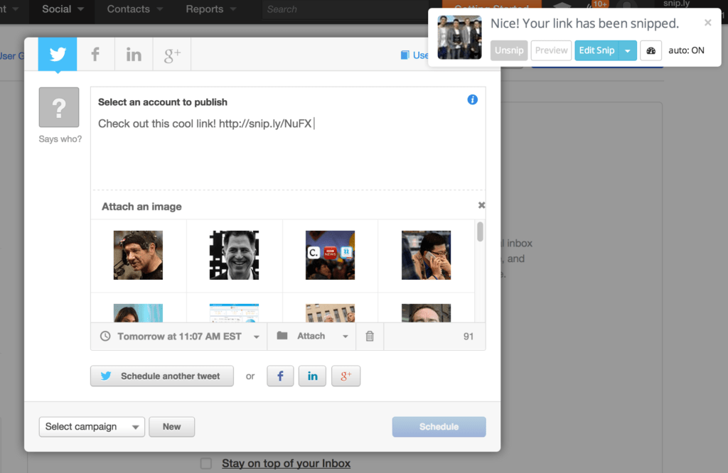 Sniply has browser extensions that allow you to Snip links right from the HubSpot dashboard. Once you’ve installed one of the extensions, you’ll see Sniply embedded directly into the sharing experience, ready when you are. If you want, you can activate the optional AutoSnip feature (off by default). AutoSnip will automatically Snip any links you share onto social media using HubSpot’s message publishing feature. This means that you can add Sniply messages to all your HubSpot social media messages without having to come back to our website every single time! Whenever you paste a link into the HubSpot message creator, Sniply will automatically Snip the link.
