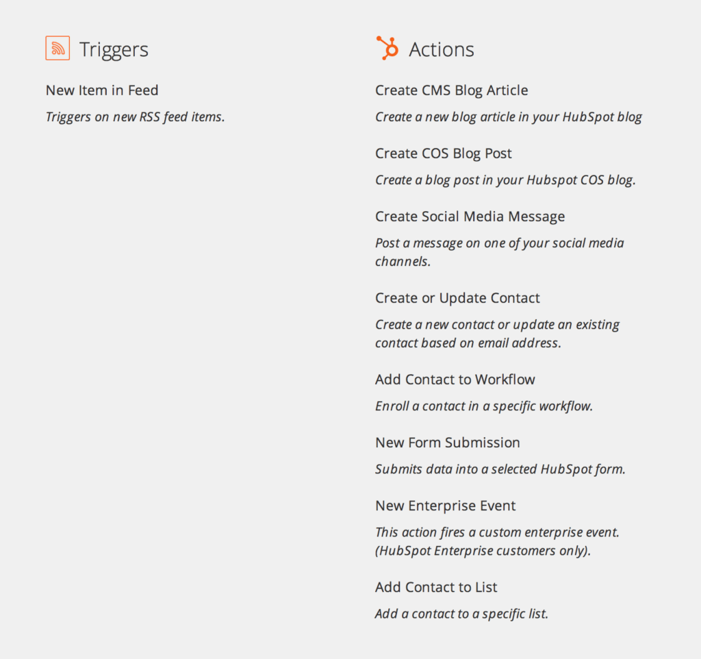 Sniply Feeds allow you to create Sniply links out of entire streams of content. Using Zapier, these content streams can be used to do a variety of things on HubSpot, as you can see from the list to the left. For example, if you would like to publish a new Social Media Message on HubSpot every time the Wall Street Journal has a new article in their technology section using a Sniply link, you could use Sniply Feeds and Zapier to accomplish this. To use Sniply Feeds, just find the RSS feeds for your favourite sites and then plug them into Sniply. Sniply will give you output feeds, which you can plug into Zapier. To do this, just use RSS as the Trigger app in a new Zap on Zapier. Then use HubSpot as the Action app to accomplish exactly what you need done. This is marketing automation at it’s finest!