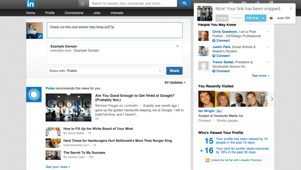 Sniply has browser extensions that allow you to Snip links as you share them on LinkedIn. Once you’ve installed one of the extensions, you’ll see Sniply embedded directly into the sharing experience, ready when you are. If you want, you can activate the optional AutoSnip feature (off by default). AutoSnip will automatically Snip any links you share on LinkedIn. This means that you can add Sniply messages to all your sharing activity on LinkedIn without having to come back to our website every single time! Whenever you paste a link into one of the LinkedIn share boxes, Sniply will automatically Snip the link.