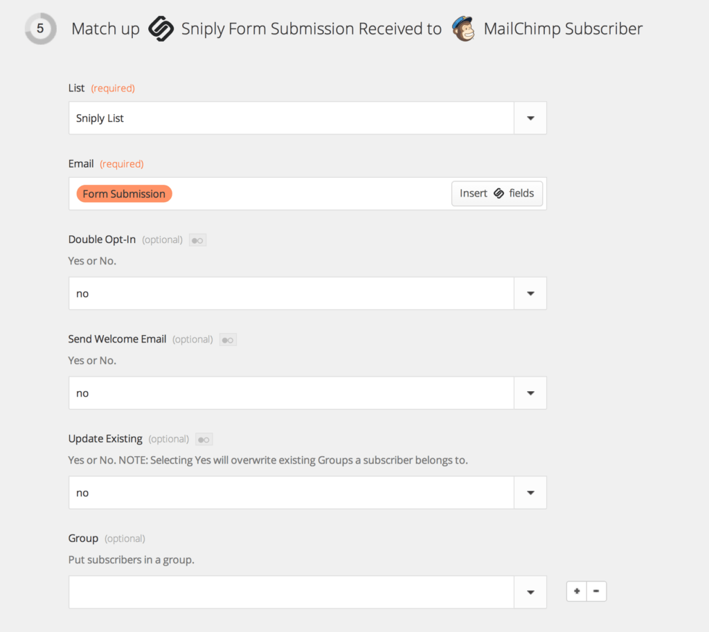 Using Zapier, you can customize exactly how you want your Sniply form submissions to be imported into Mailchimp. You can filter Sniply form submissions based on which profile you used to make the Sniply, which page you Snipped, or even which Sniply link was filled in. You can also specify default values for the info that the new Mailchimp Subscriber will get, including which list to add the subscriber to, whether or not to use double opt-in, whether a welcome email should be sent, which group the subscriber should go into, and more.