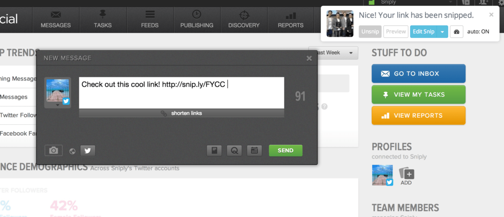 Sniply has browser extensions that allow you to Snip links right from the Sprout Social dashboard. Once you’ve installed one of the extensions, you’ll see Sniply embedded directly into the sharing experience, ready when you are. If you want, you can activate the optional AutoSnip feature (off by default). AutoSnip will automatically Snip any links you share using Sprout’s composer. This means that you can add Sniply messages to all your social content without having to come back to our website every single time! Whenever you paste a link into the Sprout Social website, Sniply will automatically Snip the link.