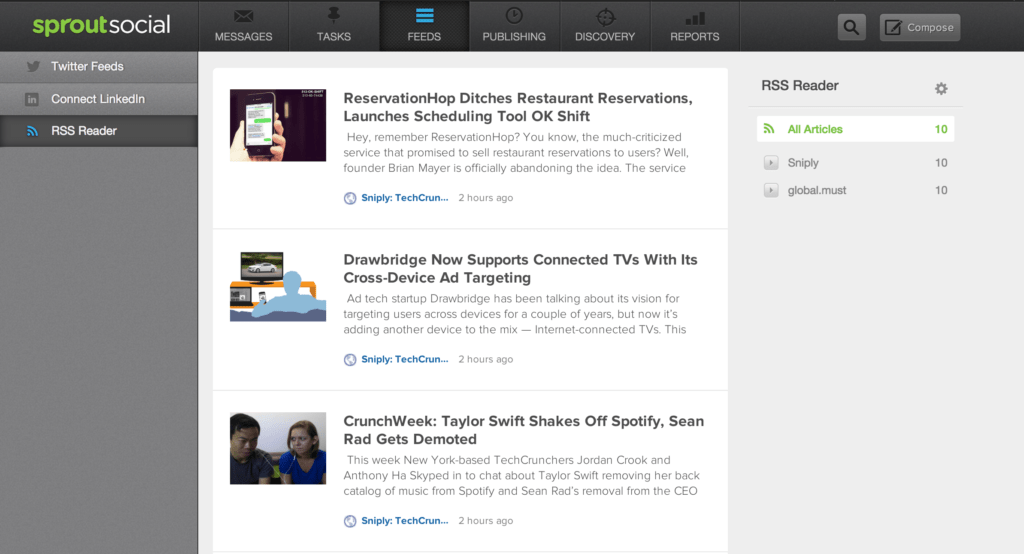 To set up the integration, all you need to do is find the RSS feeds for your favourite sites and then plug them into Sniply. Sniply will give you output feeds, which you can plug into Feedly. Then these feeds will show up in your Sprout Social dashboard in the “Feeds” section.