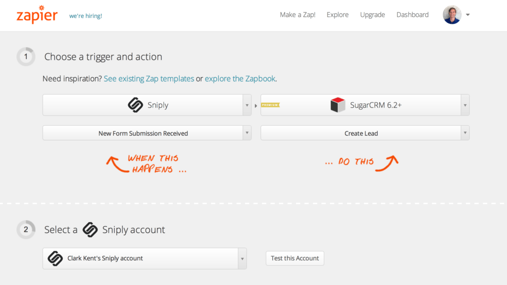 Using Zapier, you can customize exactly how you want your Sniply form submissions to be imported into SugarCRM. You can filter Sniply form submissions based on which profile you used to make the Sniply, which page you Snipped, or even which Sniply link was filled in. You can also specify how you want the data to be imported into SugarCRM, as a new contact, lead, or other object.