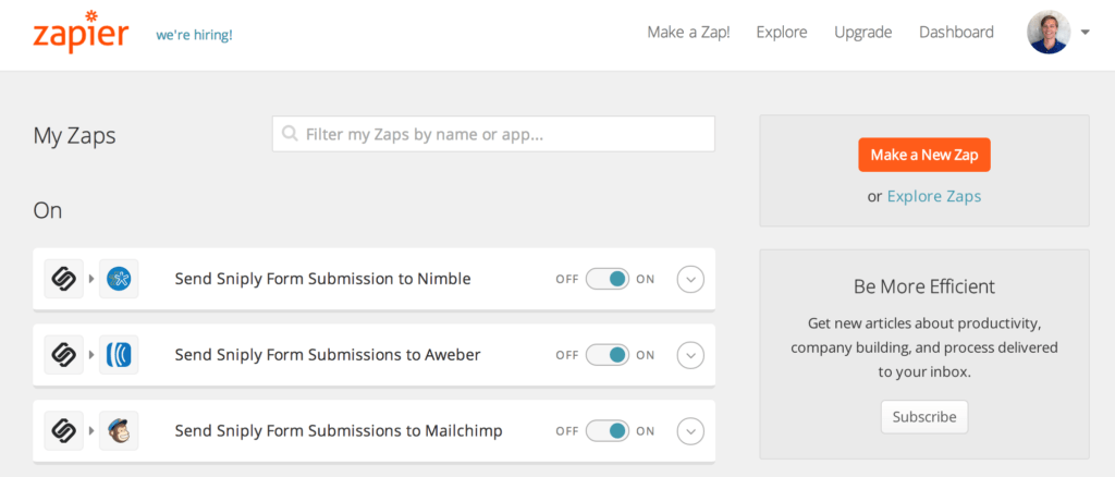 If you are using Sniply Forms, you are likely collecting contacts through Sniply. But how can you import these contacts into your CRM? How can you be notified when someone fills out one of your forms? How can you add your new contacts to your mailing list? Zapier is the answer to all of these questions! Create a Zapier account, then connect your Sniply account to it. Sniply will then send your form submissions to Zapier and Zapier will forward them to your favorite web apps.
