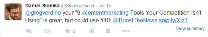 This trick is a bit cheeky, but when you think about it, it’s really harmless. Everybody gains from it: I, of course, got clicks on my Sniply CTA and visits to Boost the News’s landing page. Greg Verdino himself also gained his share – in the end, I did share his article, didn’t I? He seemed to get the joke, because he did “favorite” my tweet, so no hard feelings here.
